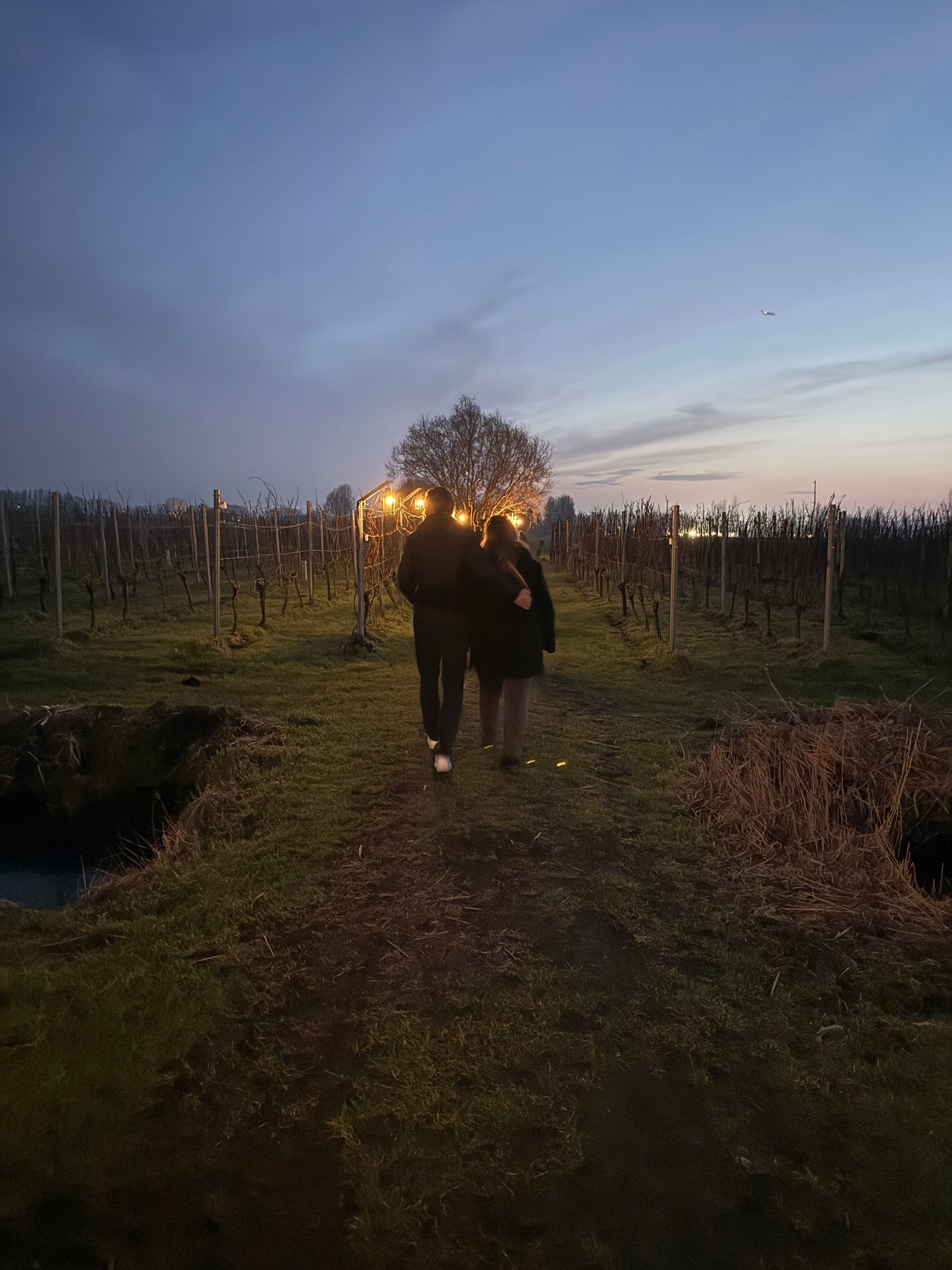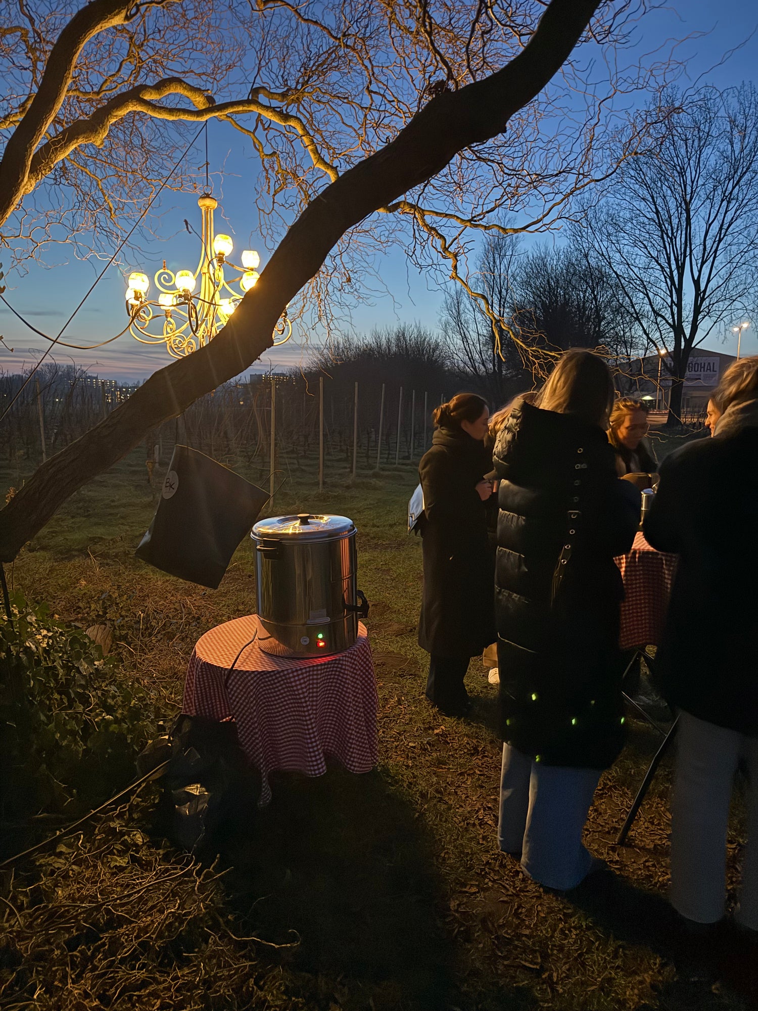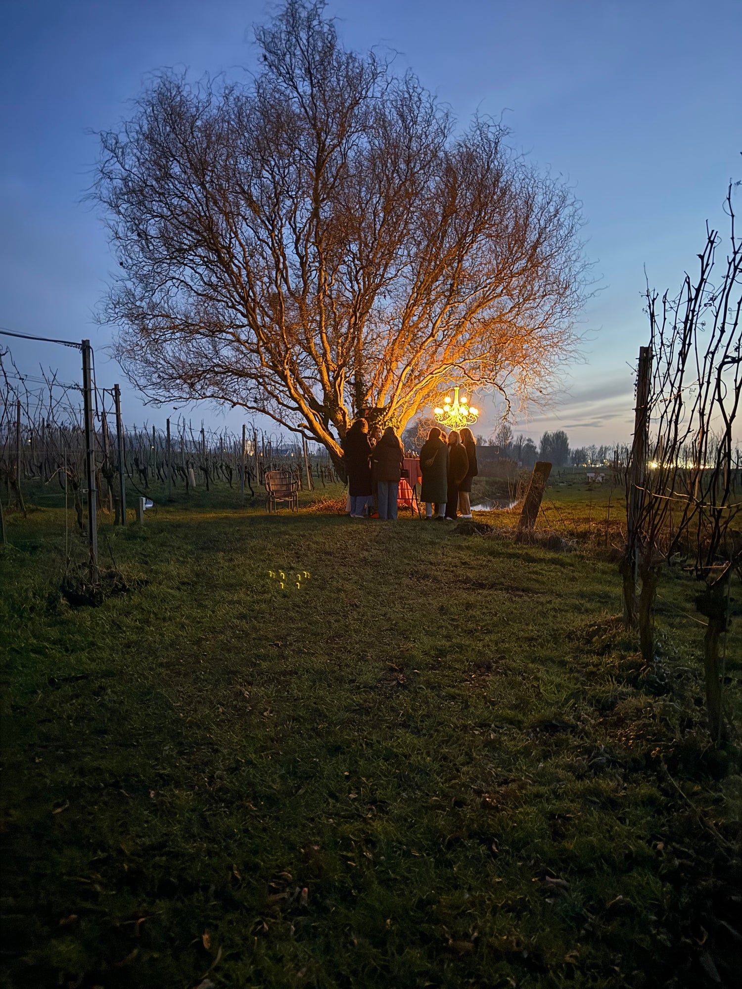 We starten met een korte wandeling door de wijngaard. Onder de grote wilg wacht een warme beloning: een glas glühwein en een klein hapje om op te warmen.