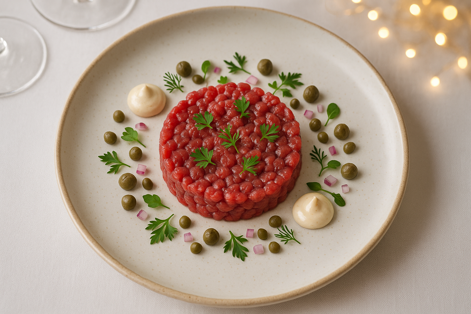 Ervaar de ultieme culinaire verfijning met onze klassieke steak tartaar - een tijdloos gerecht dat de perfecte start vormt van je kerstdiner voor de echte fijnproevers.