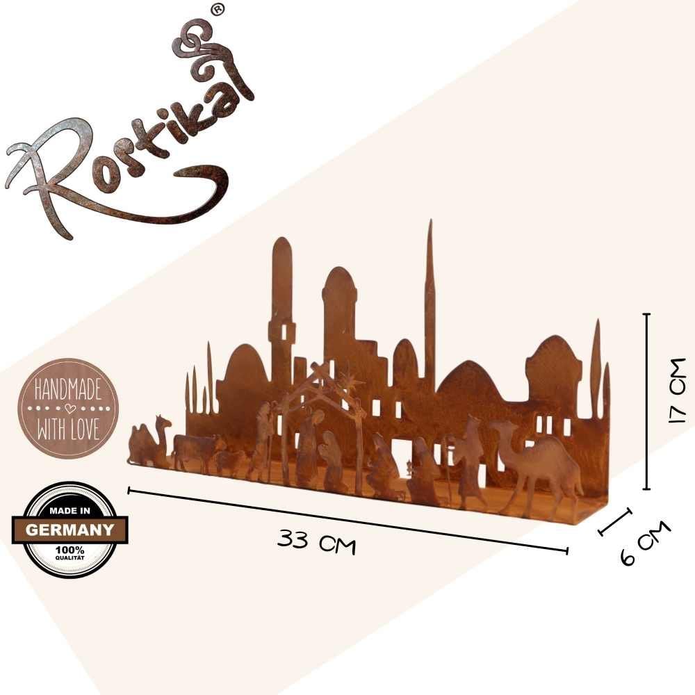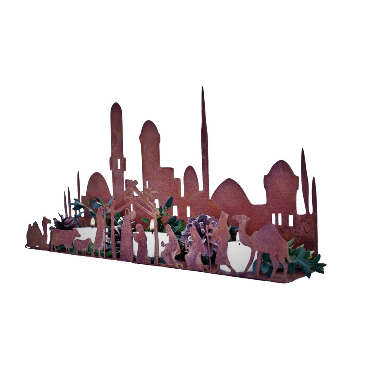 Creëer een sfeervolle en betekenisvolle kerstdecoratie met deze prachtige metalen kerststal kaarshouder van Rostikal. Deze unieke kandelaar combineert het klassieke kerststal silhouet met een praktische kaarshouder en heeft een authentieke roest patina afwerking voor een nostalgische uitstraling.