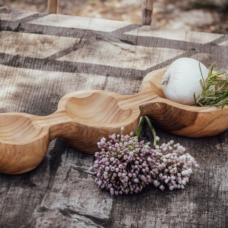 Deze Triple Teak kom is een aanwinst voor elke keuken. Het natuurlijke teakhout en handgesneden karakter maken elk stuk uniek, terwijl de robuuste constructie zorgt voor jarenlang serveerplezier.